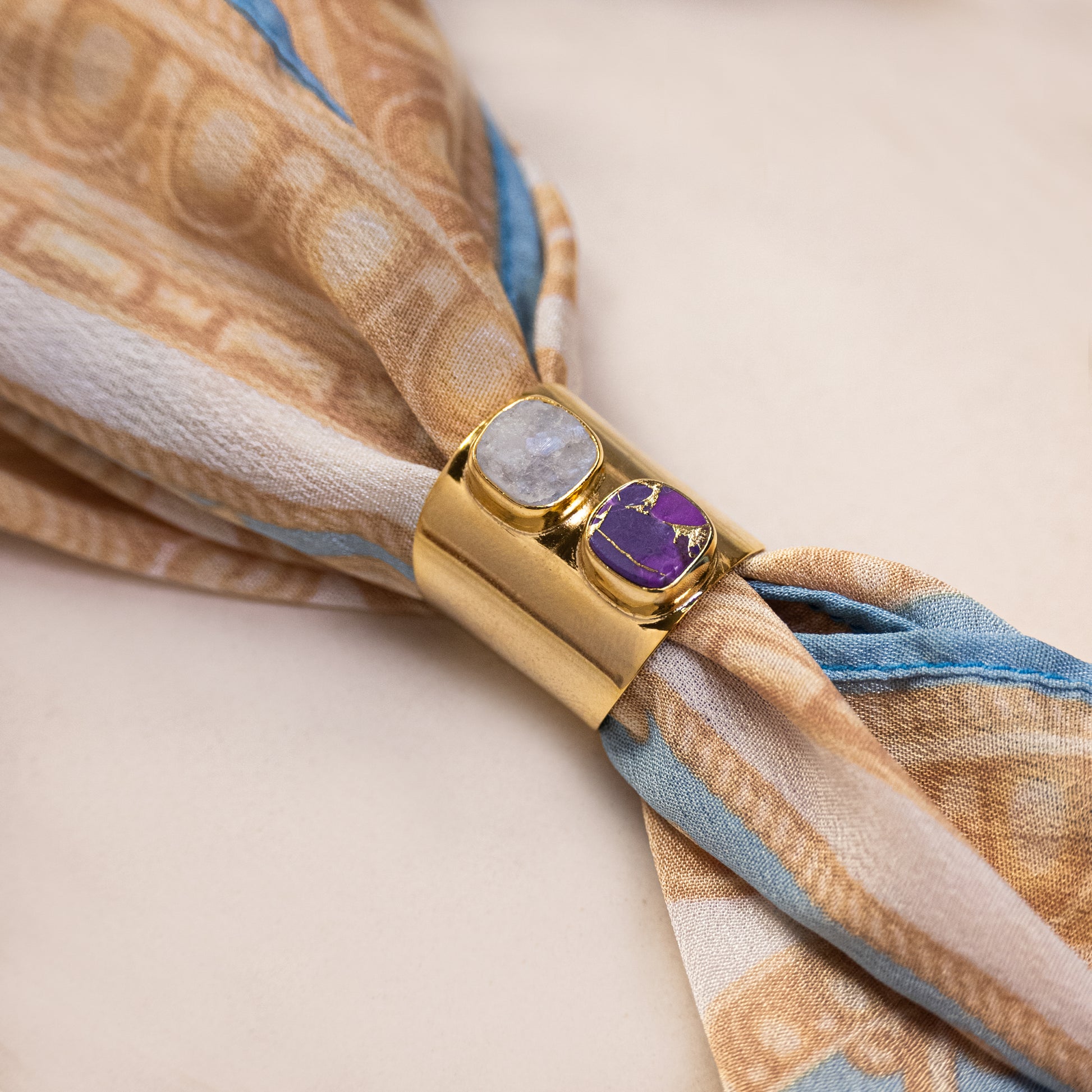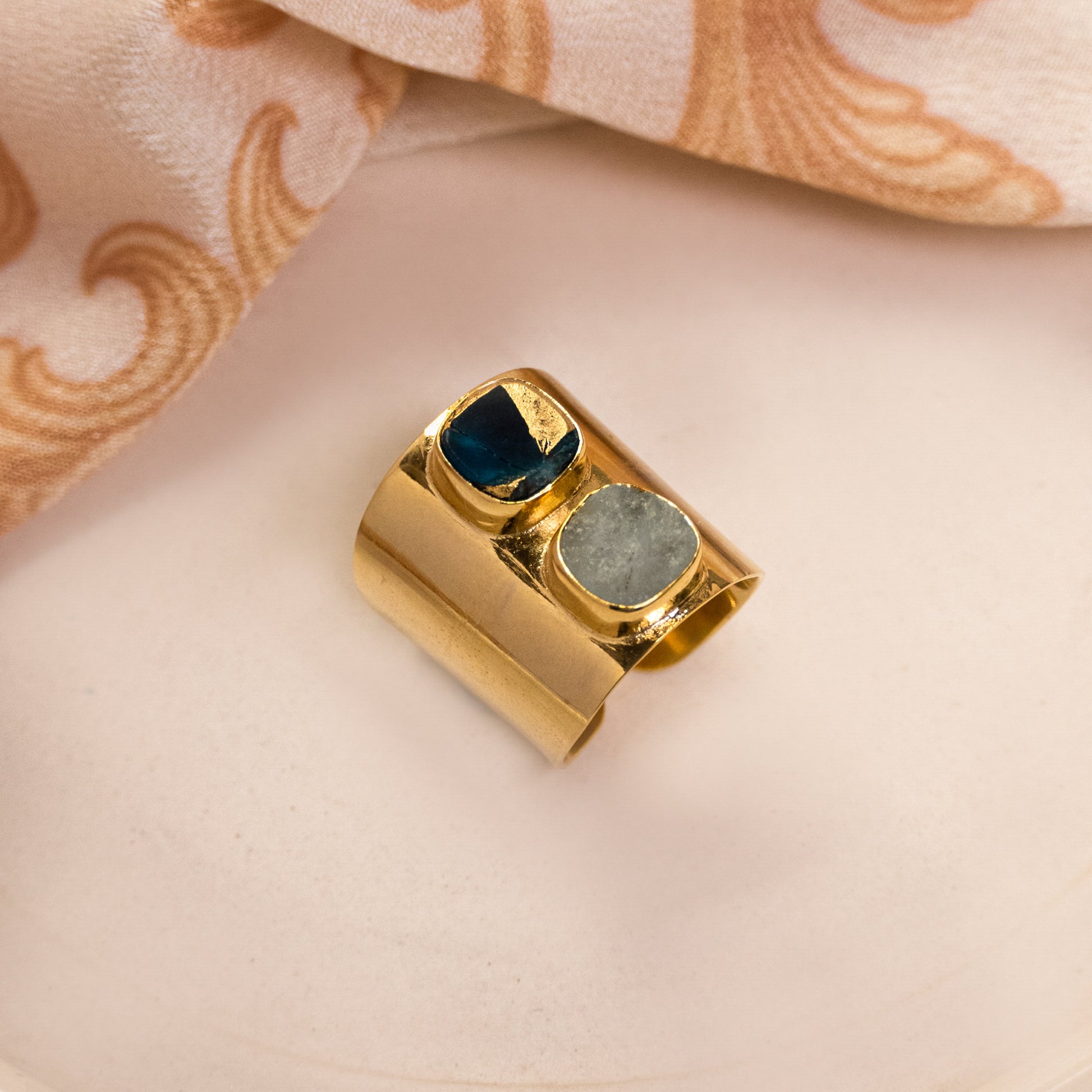 Handcrafted in brass and plated in 18k gold, the ring features two asymmetrically placed semi-precious gemstones, each unique in hue and texture. Their subtle irregularity enhances the sculptural surface of the polished band, creating a piece that feels as organic as it is refined.