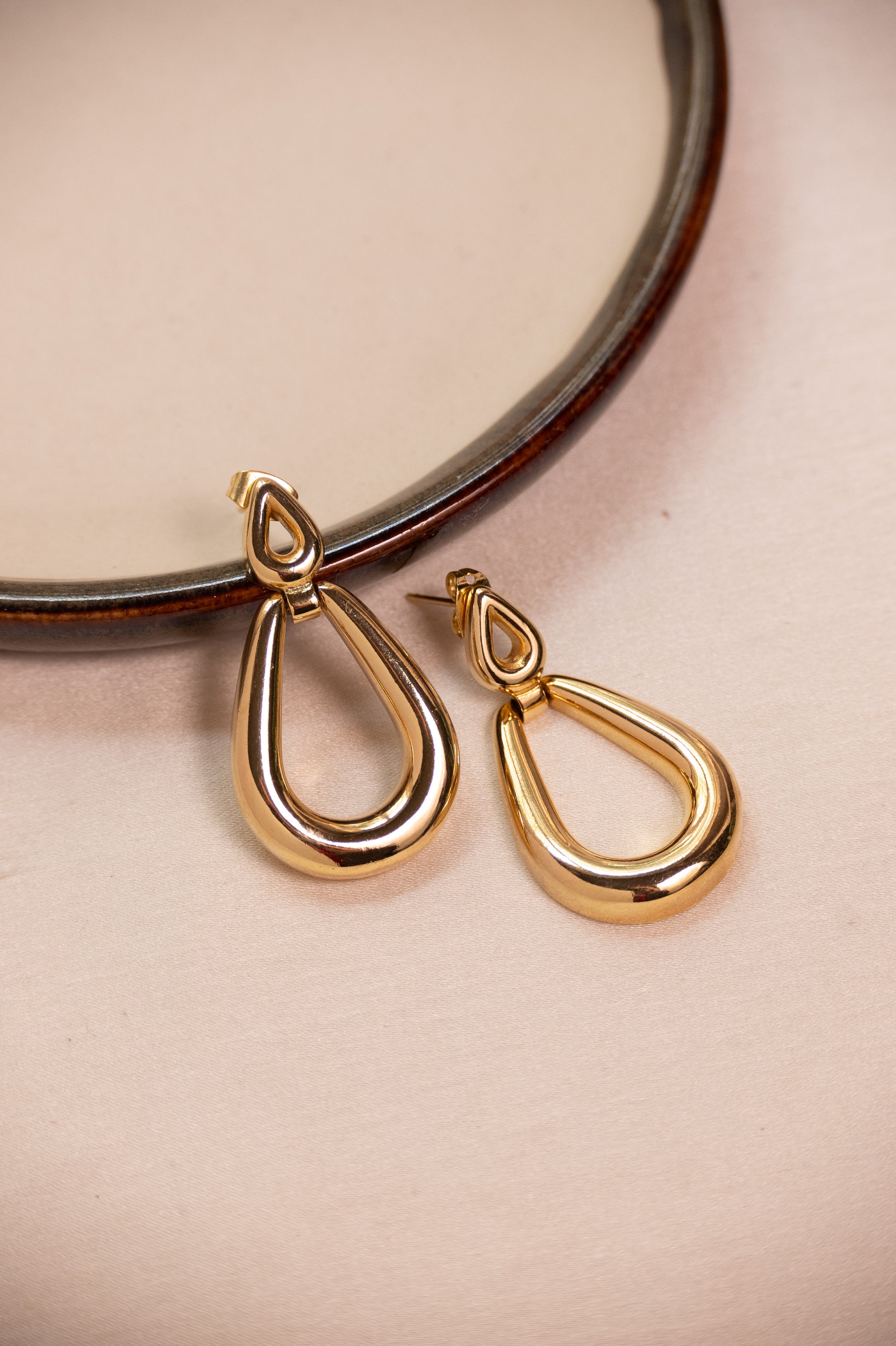 Crafted in brass and coated with a luminous 18K gold plating, the Elara Drops reflect light with effortless grace. The dual-drop design brings a touch of sculptural sophistication — bold enough to make a statement, yet timeless in its simplicity.