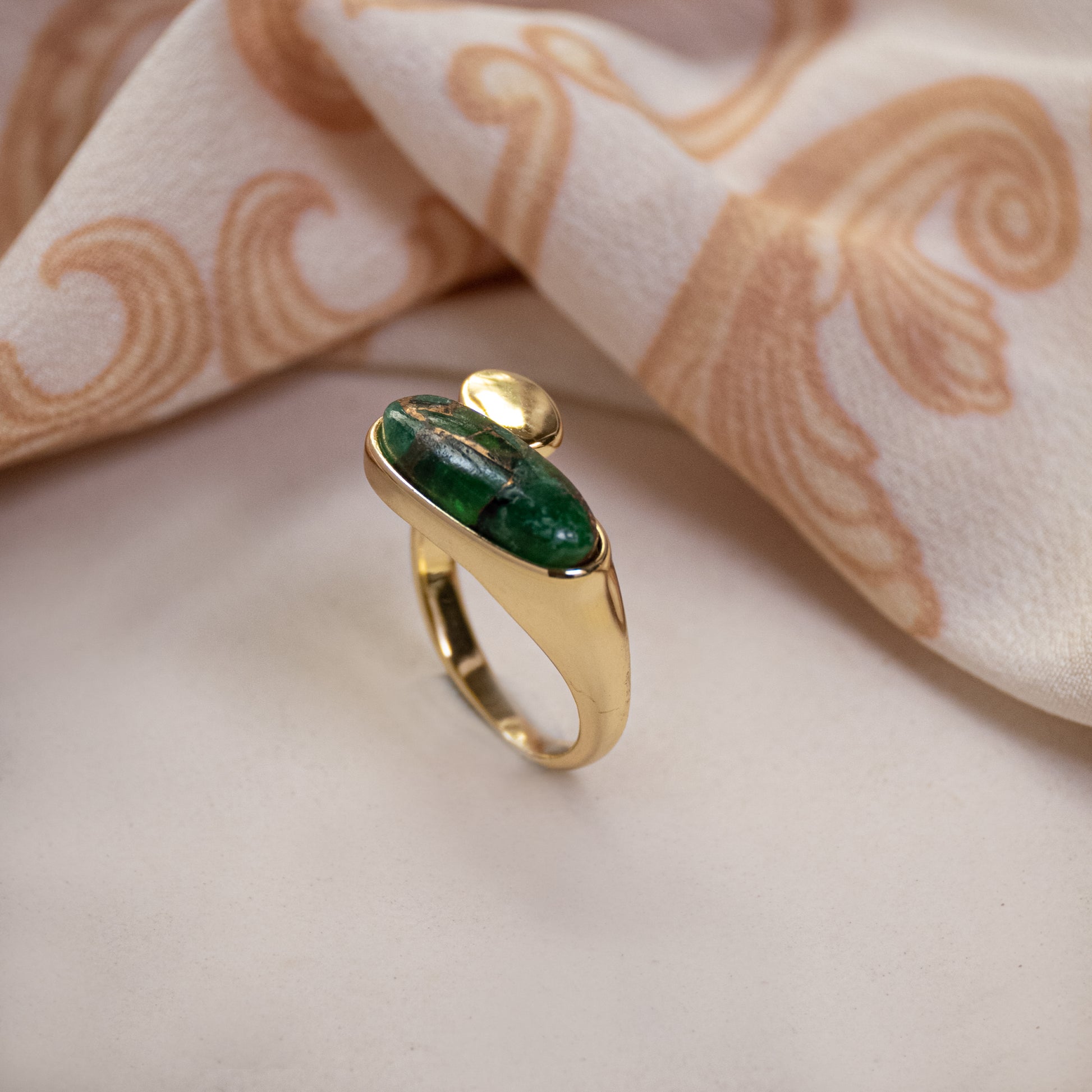 The Halcyon Ring captures the quiet depth of the horizon in stone and metal. Casted in brass and plated in 18k gold, its smooth, sculptural band reflects a quiet strength, while the vivid Copper Turquoise gemstone adds a touch of ethereal radiance.