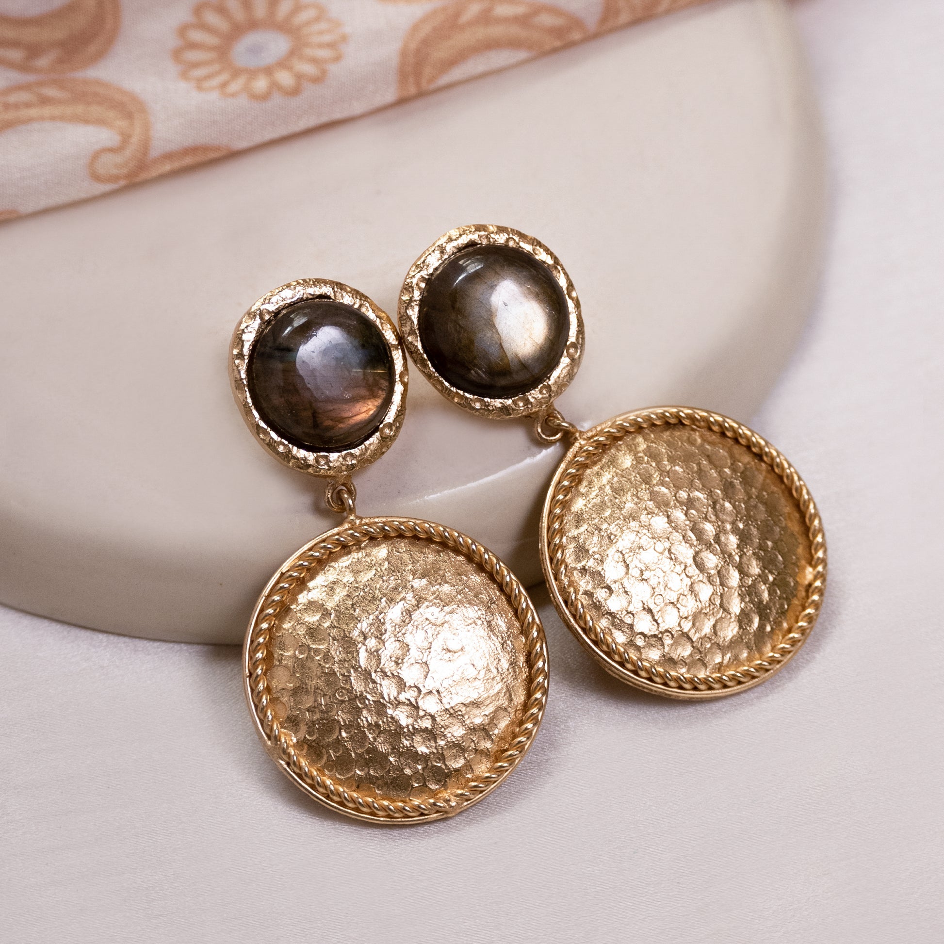 The Lunara Disc Drops are crafted in brass with radiant 18k gold plating, featuring a luminous labradorite stone suspended within a textured medallion. The hammered finish and braided rim catch the light with quiet elegance, creating a warm, sculptural glow.