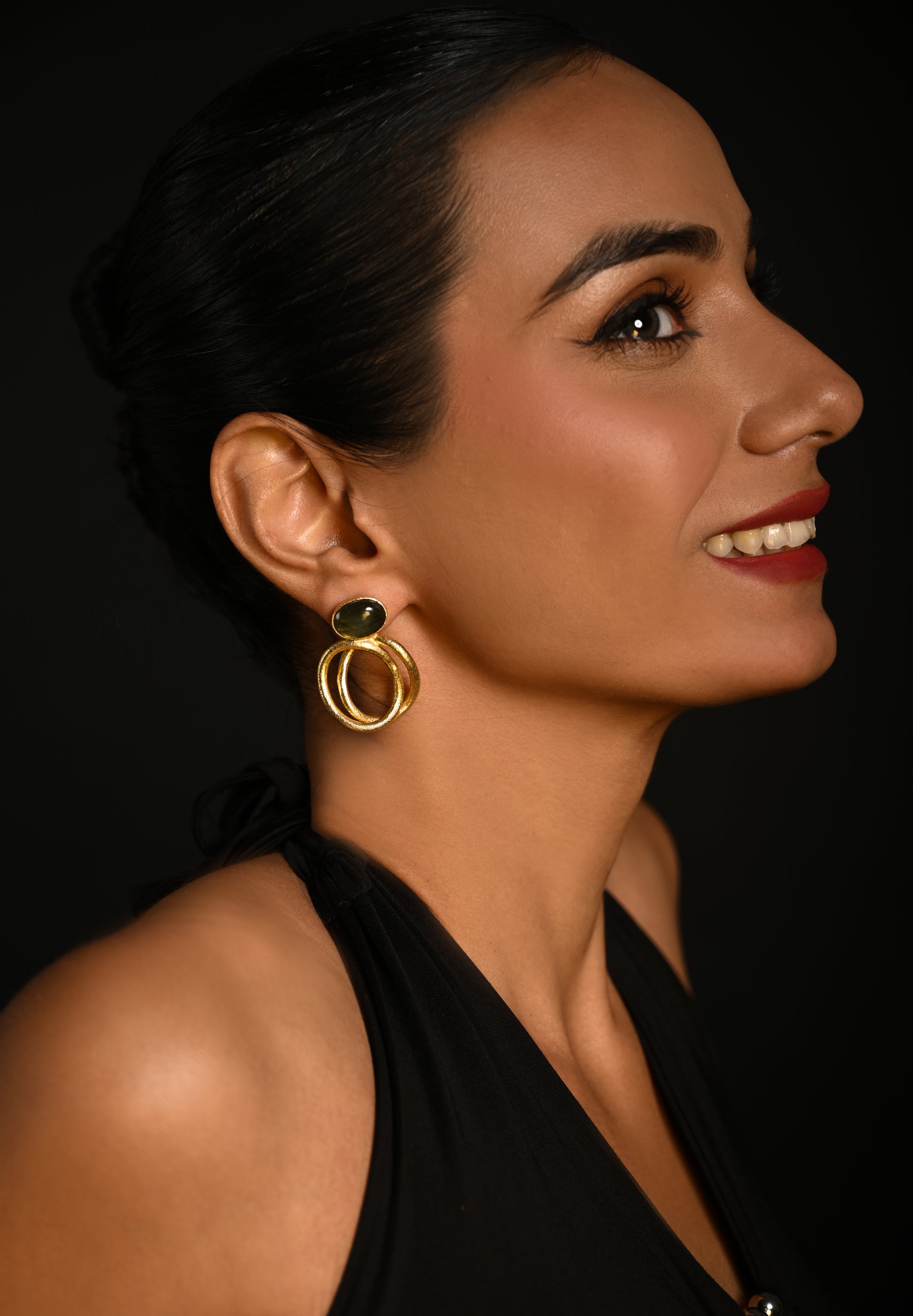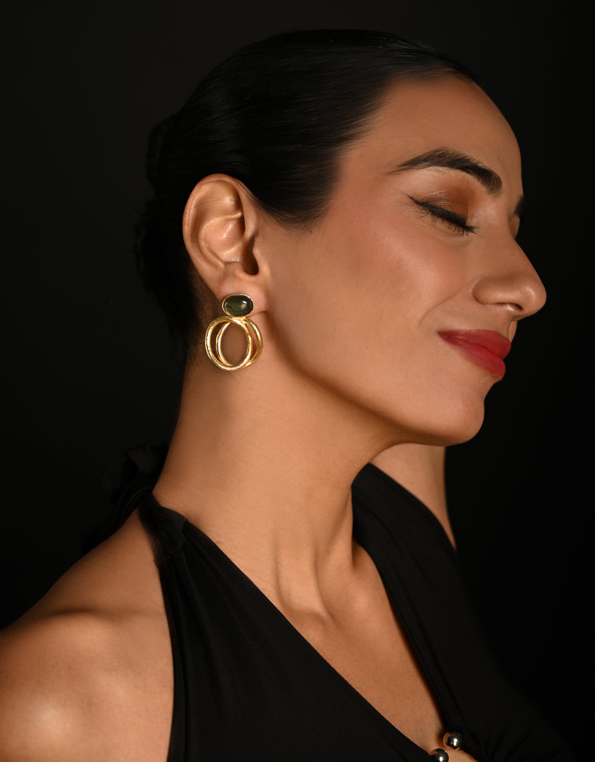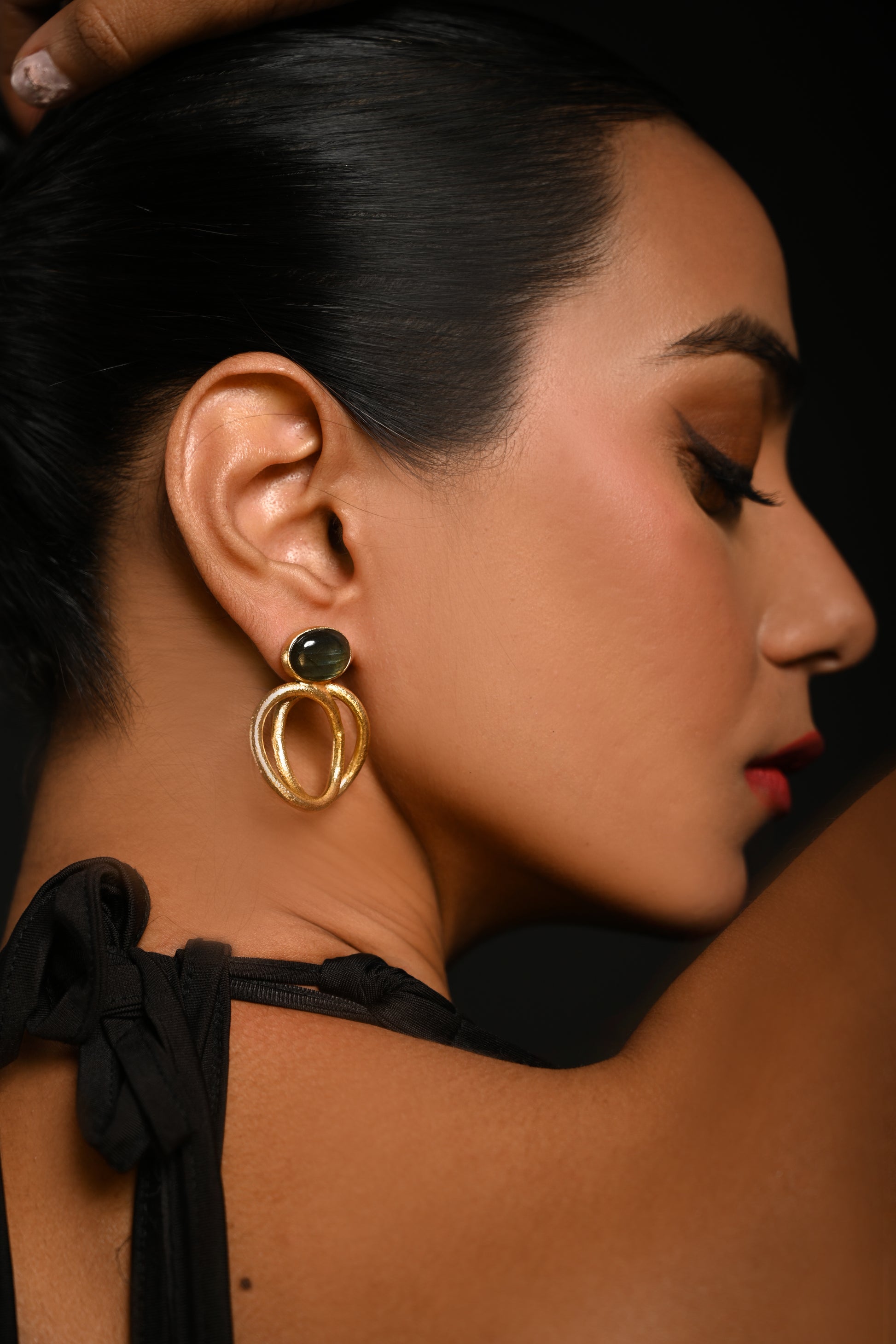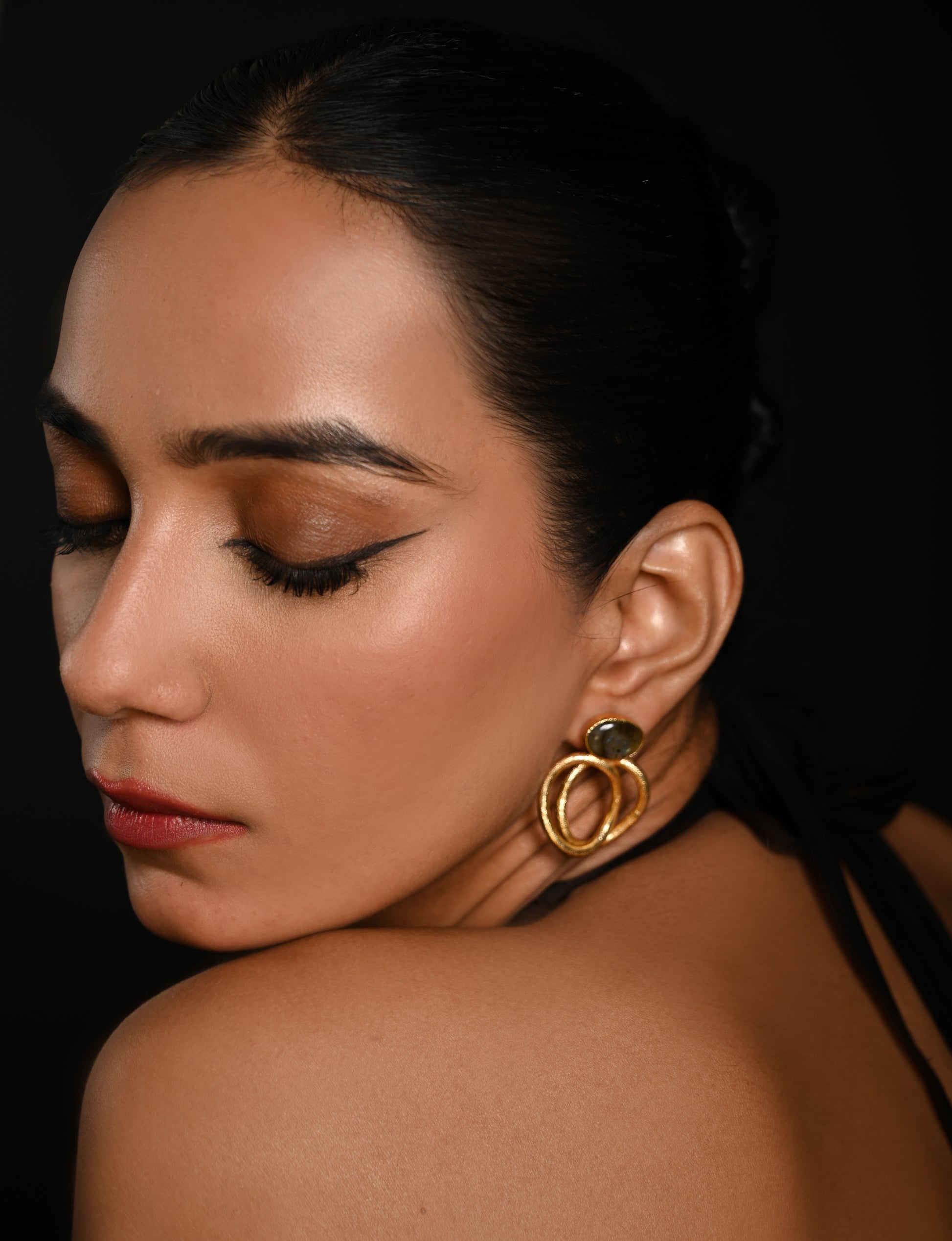 Mysterious, luminous, and deeply elegant - the Mirage Hoop is where natural energy meets sculptural design. Hand-casted in textured brass, the piece features a glowing labradorite stone that shifts hues with the light, revealing flashes of green, blue, and gold.