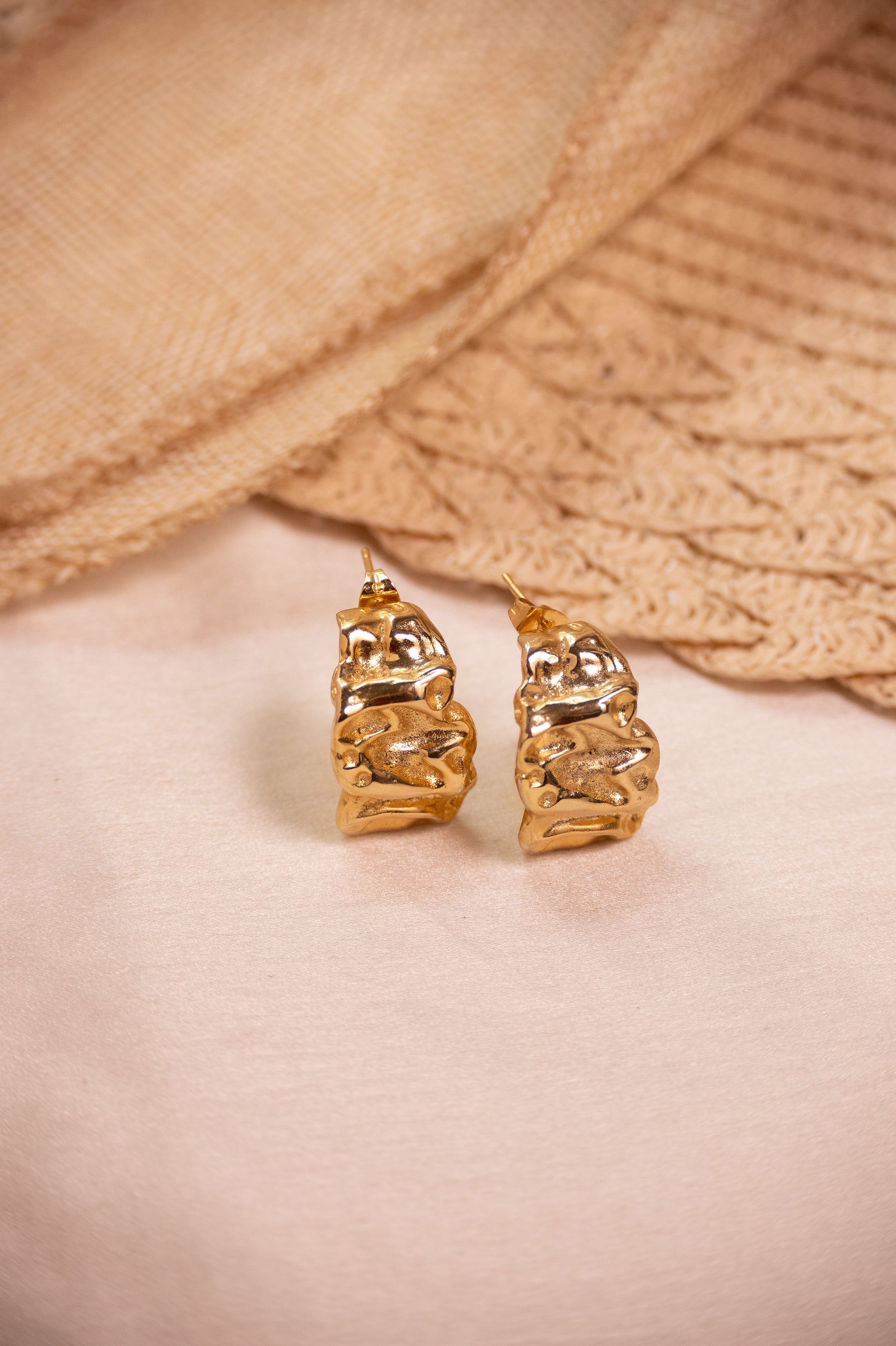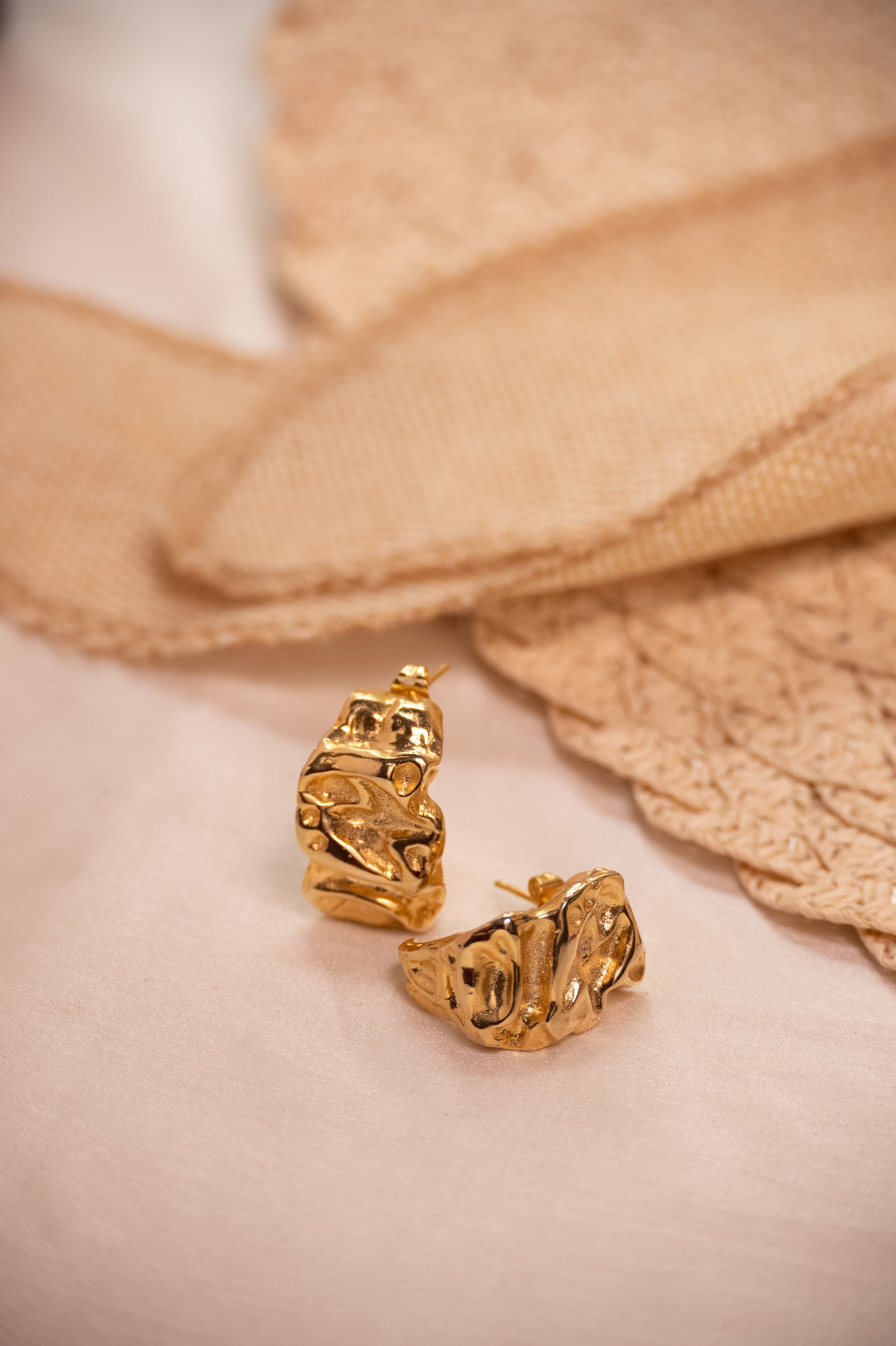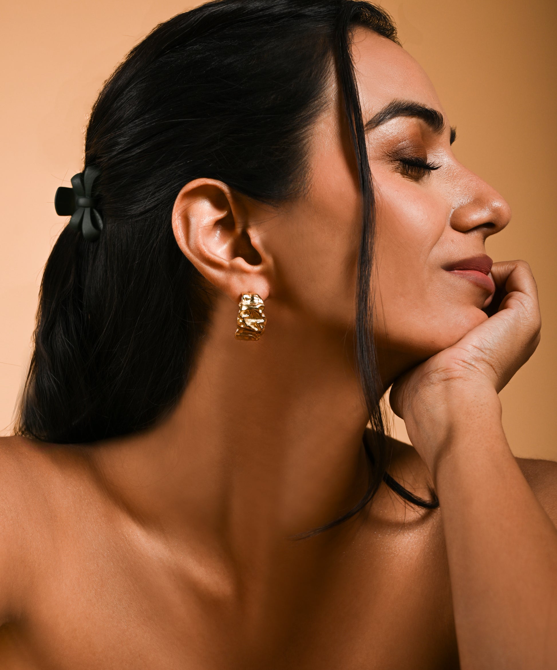 Inspired by the fluid beauty of molten metal, the Molten Hoops captures the art of organic imperfection. Casted in brass and coated with a lustrous 18K gold plating, its sculpted, free-form texture reflects light from every angle - creating a look that’s bold yet effortlessly elegant. Each curve tells a story of movement and modern artistry, making it a statement piece for those who embrace individuality.