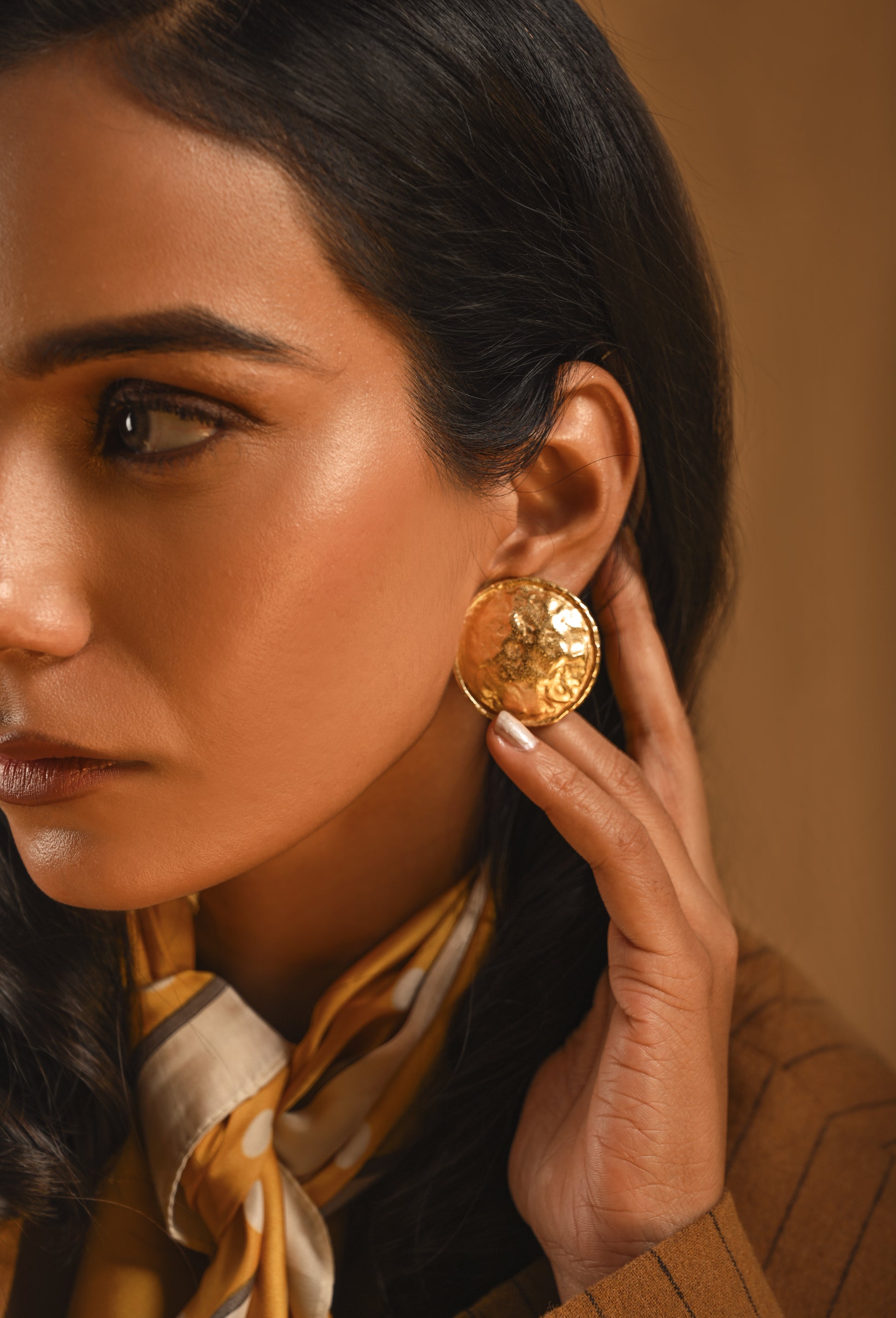 Sculptural and timeless, the Sun Disc earring captures the quiet beauty of handcrafted imperfection. Cast in brass and finished with an 18K gold plating, its molten, sun-disc form reflects light with a soft, organic glow.