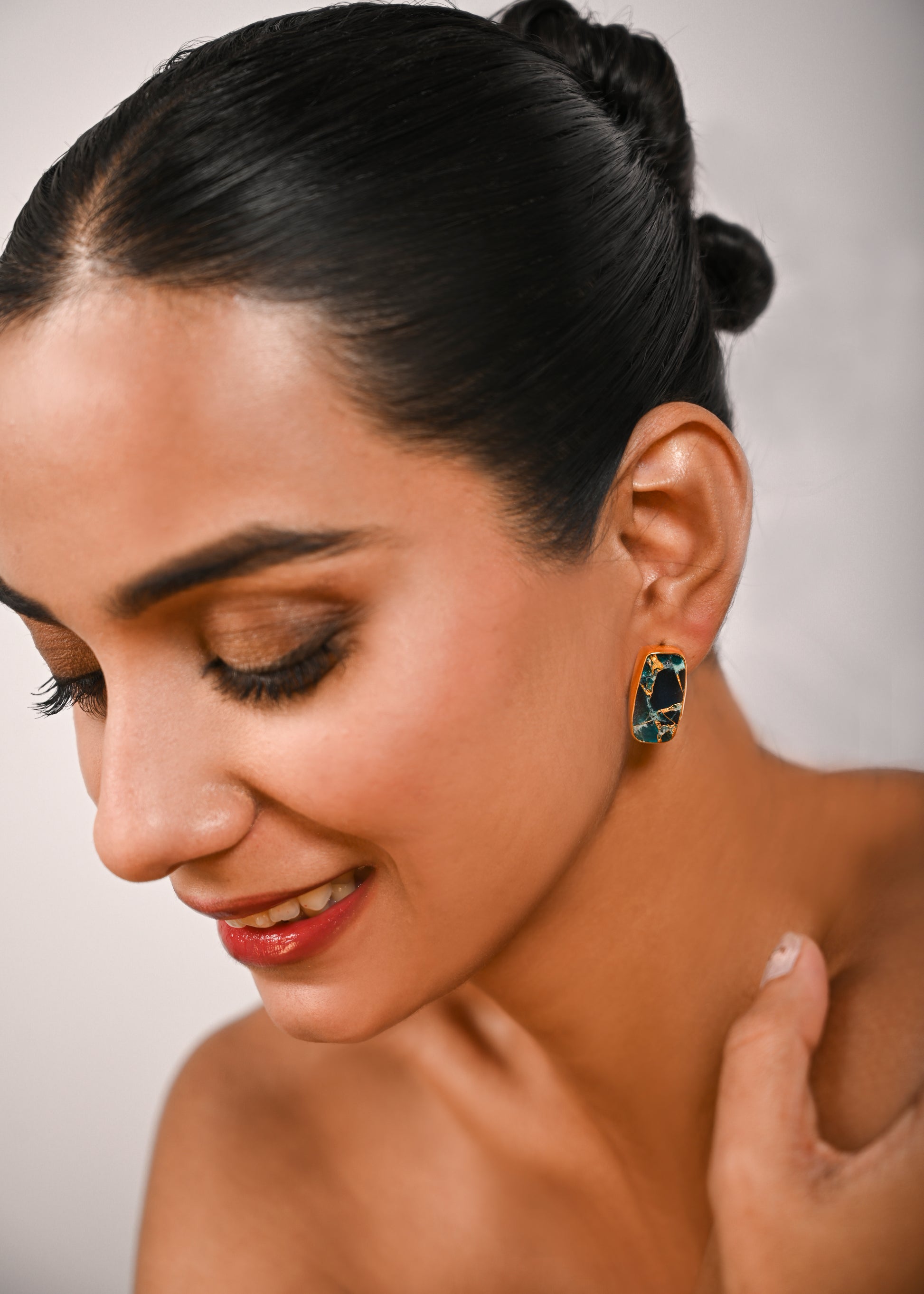 The Terra Studs embody the poetry of nature’s textures — raw, refined, and radiant. Handcrafted in brass and plated with 18k gold, each earring features a rich Copper Turquoise stone framed in molten gold, its veins and fractures creating an organic map of light and shadow.